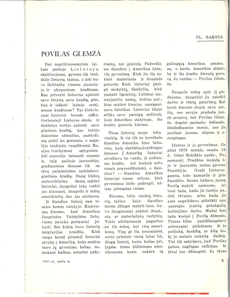 Leafing through the magazine, I found a two-page interview for Povilas Glemza. I guess the spelling of his last name changed over time. It was Glamzo under his portrait. I couldn’t read further because the magazine was entirely in Lithuanian. With my curiosity piqued, I hoped to get it translated and unlock the mysteries of his life.